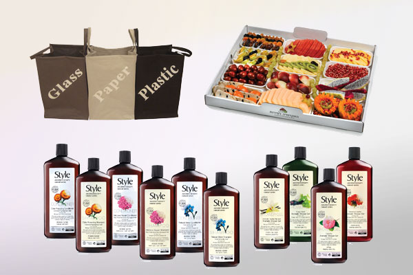מגש פירות של האקדמיה לפירות, סל מיחזור של Golf&Co וג'ל רחצה של Style Aromatherapy