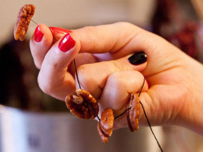 1. משחילים את החוט במחט ויוצרים 20 מחרוזות של אגוזים. משאירים עודף בקצוות כדי לתלות לייבוש.