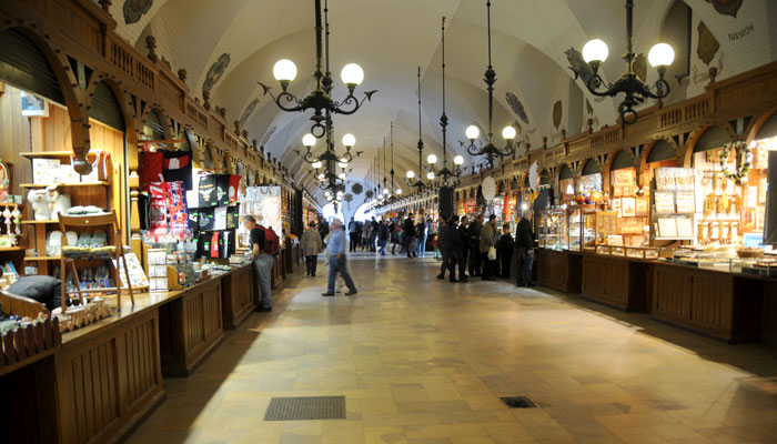 בקרקוב, שאמנם אינה מצויה בדיוק על דרך הענבר, מצאנו עבודות ענבר מרהיבות באולם הבדים (Sukiennice), אותו בניין מרהיב שחולש על כיכר השוק המרכזית, רינק גלובני (Rynek Glowny). כיכר זו היא הגדולה ביותר בפולין ואולי אף באירופה, וכל כולה יצירת מופת אורבנית.