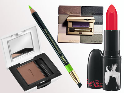 מימין לשמאל: שפתון אדום של MAC מקולקציית מרלין מונרו; פלטת צלליות לחורף של קלרינס (צילום: דיוויד מוריס); עיפרון עיניים ירוק זרחני של איב סאן לורן; צללית מונו חום מאט של קרליין (צילום: מוטי פישביין)