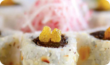 - פורסים אצה על מחצלת ומניחים מעל את האורז והפירות היבשים. מגלגלים ופורסים.