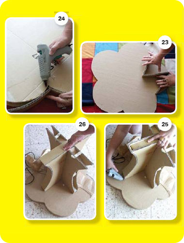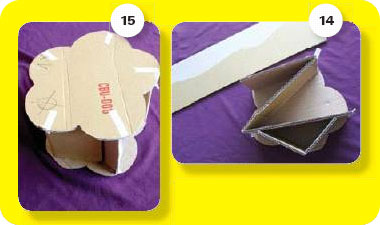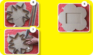 - הכינו רצועות קרטון בגובה 20 סנטימטר והדביקו אותן בצורת זיג זג מקצה לקצה על אחד הקרטונים, בצורת פרח .