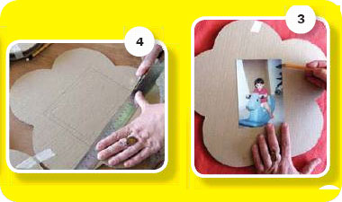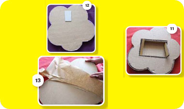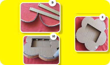 - חיתכו רצועות קרטון בעובי 2.8 סנטימטר (בהתאמה לעובי של דופן המסגרת) ובאורך המתאים לכל אחד מעלי הפרח, עגלו את הקרטון והדביקו מסביב .