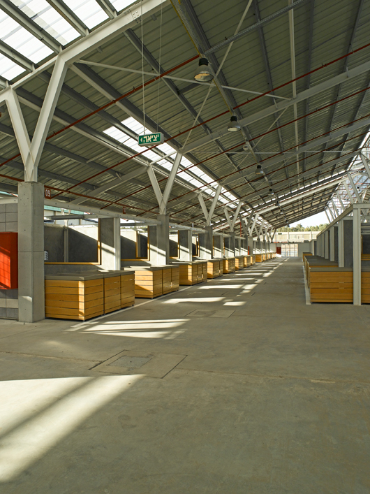 "לפני כמה שנים תכננו את מבנה השוק העירוני המקורה בקריית אתא. במשך שנים פעל שם שוק לא ממוסד שהתהווה שם אט אט בתוך שכונת מגורים, והניסיון לפנות אותו למבנה שנבנה מחוץ לשכונה לא צלח. כתוצאה מהניסיון הזה הוחלט לשתף את ועד הסוחרים בתכנון החדש, וחשוב היה לנו לעשות איתם עבודת הכנה כדי להבין מה הם הצרכים והציפיות שלהם מהמקום החדש. הפרוגרמה נבנתה עם הסוחרים וזה משהו שאנחנו גאים בו במיוחד. בנינו האנגר בעל קירות בטון וגג פלדה שמתכתב בשפתו העיצובית עם סככה חקלאית. בנייתו מאלמנטים טרומיים אפשרה לנו לעמוד בלוח הזמנים הדחוק של הפרויקט. בתוך המבנה יצרנו שני "רחובות" המוקפים בחנויות, שגודלן, רוחב המעברים ביניהן והפתחים שלהן נקבעו בשיתוף הסוחרים. נוסף על כך שילבנו אלמנטים ירוקים כמו שפע של אור יום ואוורור פסיבי, והתוצאה היא שהשוק נשאר שוק פעיל שוקק סוחרים ומבקרים גם במקומו החדש".