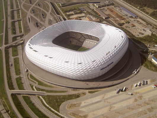 המגרש הביתי של באיירן מינכן המפוארת ושל מינכן 1860, קבוצה מהליגה השנייה, הוקם לקראת משחקי גביע העולם בכדורגל בשנת 2006. כדי לפתור את בעיית הזהות הכפולה החליט משרד האדריכלים Herzog & de Meuron (שתכנן גם את האצטדיון בבייג'ין) לצפות את החזית החיצונית ב-2,874 פאנלים בטכנולוגיה ייחודית שמשנים צבע בהתאם למדי הקבוצה המארחת – לבן, אדום וכחול.