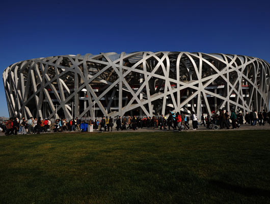 האצטדיון בבייג'ין הפך לסמל המשחקים האולימפיים בשנת 2008 ונחנך בטקס הפתיחה. צורתו העגולה מייצגת את השמיים בשעה שמתחם סמוך המיועד לספורט המים ומעוצב כקובייה מייצג את האדמה. מתוך 13 הצעות שהוגשו נבחרה זו של משרד האדריכלים Herzog & de Meuron משווייץ, שהתבסס על סגנון עיצוב בקרמיקה סינית בשילוב קורות פלדה.