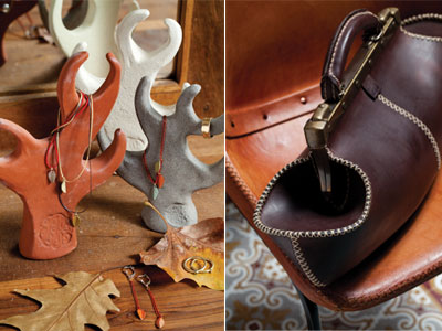 מימין: כיסא עור, 990 שקלים. פלורליס, תיק עור של סקלסקי 2,000 שקלים. הסילו של עדילי | משמאל: מעמד לתכשיטים מחמר בעבודת יד, 140 שקלים. דניאלה ארד – סטודיו לקרמיקה, תכשיטים מסדרת עלי סתיו: שרשרת, 91 שקלים; צמיד או עגילים, 72 שקלים. סטודיו יו יו 32