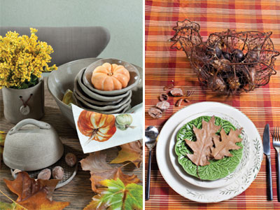 מימין: צלחות קרמיקה לבנות, 398 שקלים למערכת של 18 חלקים; פקעות לקישוט, 10 שקלים ליחידה. טורקיז האוס; סכו"ם, 71 שקלים ל-4 חלקים. פלורליס; סל תרנגולת, 125 שקלים. סטלה ממי; מפה משובצת וצלחת עלים ירוקה. אוסף פרטי | משמאל: כלי לחמאה, 95 שקלים, כלי עם מטבע, 95 שקלים; קעריות, 55-45 שקלים; קערה גדולה בגוון אפור-חאקי, 220 שקלים. דניאלה ארד – סטודיו לקרמיקה; עלי שלכת מבד לקישוט, 8 שקלים לחבילה. פנלופה; דלעת. גרינפטר טריות מהשדה; מפית בד מאוירת. אוסף פרטי