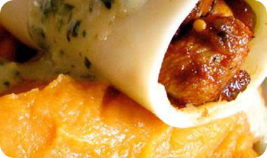 - מניחים מעט פירה על צלחת הגשה, מסדרים מעל 2 יחידות קנלוני ויוצקים מעט מהרוטב. מפזרים זרעי חרדל מסביב.