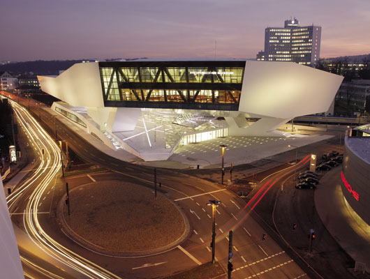 מתוך 170 הצעות שהוגשו לתכנון המוזיאון ב־2004 נבחרה הצעתו של משרדDelugan Meissl Associated Architects מווינה, והעבודות בו הסתיימו בינואר 2009. הבניין, המאופיין בקווים ישרים ובמראה אולטרה מודרני, נתמך בשלושה עמודים בצורת V, אשר מעניקים לו מראה מרחף. אופי המותג תורגם לזוויות, לצורות אוונגרדיות ולחזית בגובה 23 מטרים מעוטרת בלוגו שאי אפשר לפספס. פסי תאורה גיאומטריים משתקפים בחיפוי דמוי מראה בחלקו התחתון של המבנה "הצף", ומתכתבים עם תכנון התאורה במבואה, מעל גרם מדרגות לבן בוהק. העיצוב כולו משדר מודרניות, חדשנות, דיוק וטכנולוגיה מתקדמת, הערכים שעליהם מתבססות מכוניות היוקרה שהחברה מייצרת.