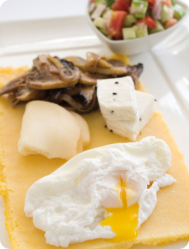 - בכף מחוררת מוציאים את הביצה ומניחים על מלבן הפולנטה. חוזרים על הפעולה.