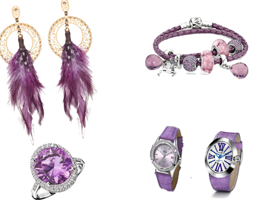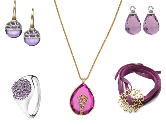 מימין לשמאל ובכיוון השעון:עגילי Pandora, זודיאק (ה.שטרן), שרשרת (קרו וולף), טבעת Pandora, עגילי יהלומים חצי תחרה בזהב צהוב עם אבן אמטיסט ; .צילום: yohan petterson, דיוויד ווילס, דדי אליאס, אלכס קוצ'רנקו