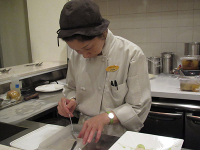 התיישבנו על הבר וצפינו בצ'יקה, בעלת הבית ממוצא יפני, שיצרה מנות מרהיבות ביופיין תוך שימוש בטכניקות מהמטבח המולקולרי.