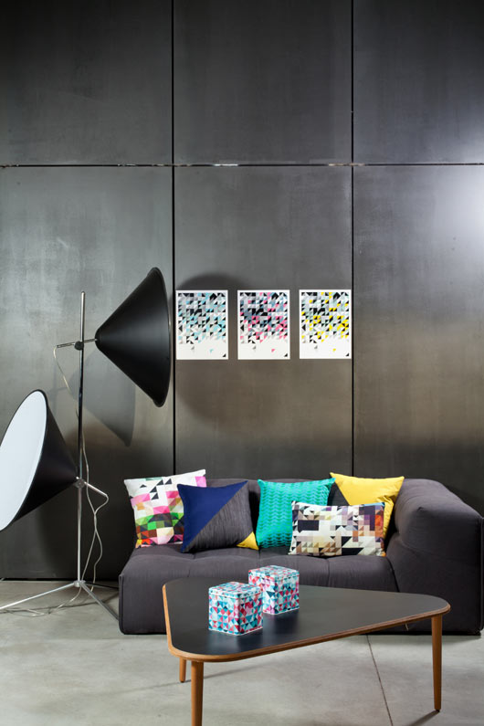 <br /> חלק מספה פינתית, 17,310 שקלים; גוף תאורה בעיצוב טום דיקסון, 15,000 שקלים, The Box. פוסטרים, 90 שקלים ליחידה, הביתה. כריות תפורות ממשולשים בצהוב, אפור וכחול, 250 שקלים ליחידה,design for living G! . כרית טורקיז בדוגמת משולשים, 185 שקלים, קאס אוסטרליה. כריות בדוגמה גיאומטרית צבעונית, 199 שקלים ליחידה, איי.די.דיזיין.שולחן, 1,600 שקלים, אייטמס גלרי. קופסאות אחסון מפח, 49 שקלים ליחידה, רהיטי דורון.