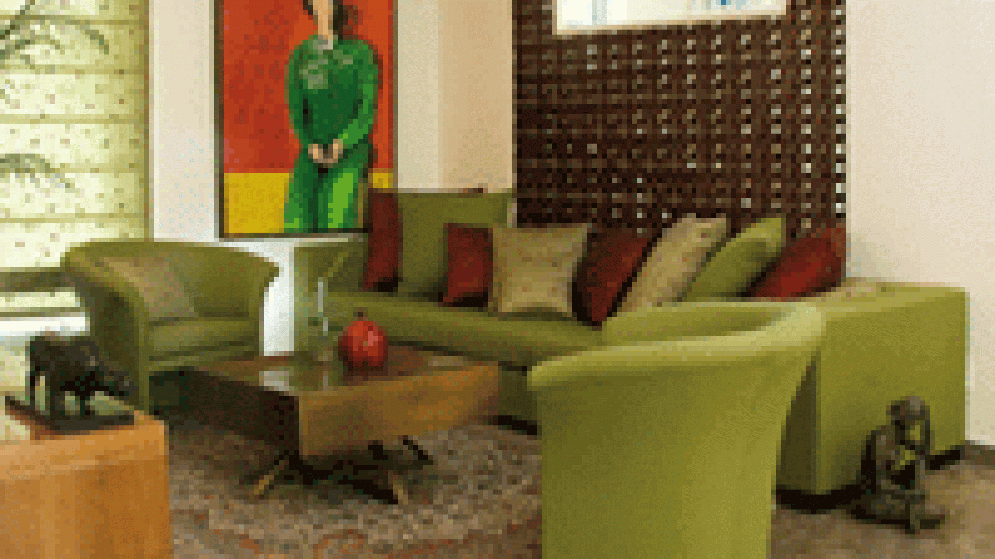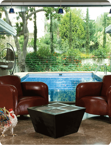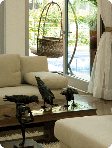 בסלון ובאזור המבואה תקרה כפולה המקנה תחושה אוורירית במיוחד. גם פתחי הסלון, הפונים לגינה ולאחת משתי בריכות הדגים, כפולים וכמו מכניסים את החוץ פנימה. וילונות עצומים (נריה), משני בדים בגוון בז' ועליהם בד לבן חצי שקוף, תולים מהתקרה. חלון נמוך וארוך מאפשר להשקיף אל הבריכה גם בישיבה. פינת הישיבה מורכבת משלוש ספות בצבע אוף ווייט ומתחתן שטיח שאגי בגוון דומה. שני שולחנות נמוכים תורמים גוונים חמים של עץ אדמדם ומתכת. נישה מיוחדת הוכנה בקיר לצורך תליית ציור של אורי ליפשיץ שיצירותיו, כמו יצירות של יעקב אלוני, ידיד רובין, מאירה שמש ואחרים, מפארות את יתר חלקי הבית.