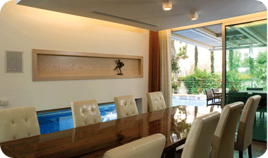 גשר זכוכית מפריד בין המטבח לפינת האוכל. קורות מתכת (רלסים) תומכות בשלוש שכבות זכוכית בעובי עשרה מילימטר האחת, המונחות זו על גבי זו. כמו הזכוכית בשאר חלקי הבית, גוון משטחי הזכוכית ירקרק ומתאים בדיוק לגווני אבני החיפוי והריצוף. את פינת האוכל מפאר שולחן גדול עשוי אדני רכבת בורמזיים בגימור לכה, שסביבו כסאות בריפוד דמוי עור בגוון בהיר. אחד הקירות חופה טפט בגוון חום כהה מעוטר פרחי בזהב. בקיר הנגדי, הלבן ונטול הקישוטים, קבוע חלון נמוך וארוך המאפשר הצצה אל הבריכה. דלתות הזזה מקושטות וילונות כבדים, מאפשרות יציאה אל פינת הישיבה בגינה. בפינה אחרת, דלת שרות המובילה החוצה מחופה במראה התורמת לתחושת גודל החלל.