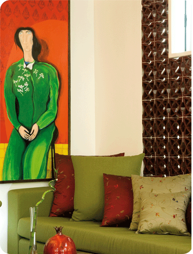 פינת המשפחה, המשמשת כפינת טלוויזיה וכאלטרנטיבה לסלון הרשמי יותר, עוצבה בהשראה מרוקנית. הקיר המפריד בין הפינה לבין חלל המדרגות נבנה לבני משרבייה בגוון חום אדמדם. הספה ושתי הכורסאות רופדו בד בצבע ירוק תפוח ועליהן הושלכו כריות בגוון דומה ובאדום עז, להשלמת אווירה חמה. הווילון בפינה זו נתפר מבד זהה לזה של הכריות הירוקות ושולחן כבד עשוי מתכת זהובה מזכיר תפאורה אוריינטלית.