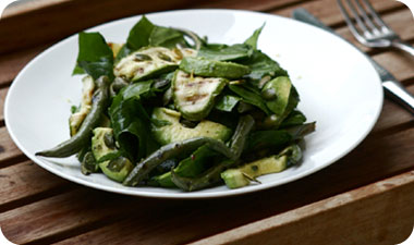 - צולים את הזוקיני והשעועית על הגריל במשך כ-3 דקות מכל צד ומעבירים לקערת הגשה. מוסיפים את עלי התרד, פלחי האבוקדו, גרעיני הדלעת והרוטב ומערבבים בעדינות. מגישים מיד.