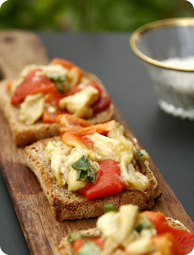 - מברישים את פרוסות הלחם בשמן זית וקולים על הגריל כ-2 דקות מכל צד, עד להזהבה. עורמים את תערובת הירקות הצלויים על הפרוסות הקלויות ומגישים.