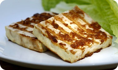 הכנה במטבח הביתי: צולים את פרוסות הטופו על מחבת או על פלנצ'ה לוהטת.