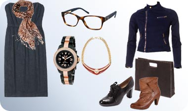 שמלת ג'ינס סטרפלס (GAP, צילום: טל טרי), ז'קט רוכסנים כחול (ליליגרייס. צילום: אודי דגן), מגפון חום (B. Unique, צילום: שלומי ברנטל), נעל חומה (bingo), תיק עור חום (MAL), צעיף מנומר (ליליגרייס), שעון שחור עם נחושת (ICE Watch), שרשרת וינטאג' (קרן וולף), משקפי ראייה בשילוב מסגרת ג'ינס וחום מנומר (שאנל).