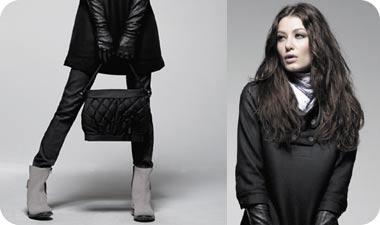 לוק שחור דרמטי מנצח – מכנסיים צמודים וטוניקה מעל, כפפות עור שחורות-ארוכות ומגפונים אפורים. תיק שחור מבד בטקסטורת מעוינים וצעיף סביב הצוואר שמוסיף נגיעה לבנה (G STAR).