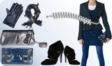 שמלת מיני כחולה עם ז'קט שחור וגרביון כחול (קילה), נעליים בגזרת פיפ-טאו שחורות (סטיב מאדן), תיק ערב אפרפר (קילה), תיק קלאץ' כחול קרוקו (פורלה), צמיד אבנים כסוף (סווטש), כפפות (פורלה), צעיף (גולברי).