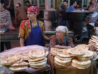 יפהפיות מקומיות עם עיניים פרסיות, שגבותיהן מחוברות באיפור מודגש, מוכרות כאן בדים נפלאים, צועניות עם מחתות רוחשות ובהן עשבי קטורת מעניקות ברכה תמורת כמה סום, נשים חייכניות ובריאות בשר אופות לחם סמוסה (Samosa, לחם הנאפה באזורים נרחבים של אסיה). הן לשות בצק, קורצות ממנו כדורים ומדביקות אותם בזריזות של שֵד על דופנותיו הלוהטות של תנור חרס. בדוכנים שב"אגף" האוכל מוכרים מנות פלוב (plov, תבשיל אורז אופייני, דומה לפילאף או אושפלו) ומנטי (manti, כיסוני בצק ממולאים בבשר כבש ומבושלים במים רותחים), ובבתי מלאכה מאולתרים עובדים נפחים ומסגרים, סנדלרים ונגרים. כאן המקום ליהנות מהכנסת האורחים האוזבקית: המוכרים נותנים לאורחיהם לטעום מלונים מעולים (בעונה), חלבה ופיצוחים.