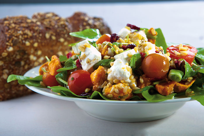 3. מערבבים בקערה את גרעיני שיבולת השועל, הבטטה, התרד, עגבניות השרי, החמוציות והגבינה. מתבלים בשמן זית, מיץ לימון ומלח ומערבבים.