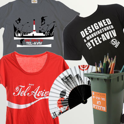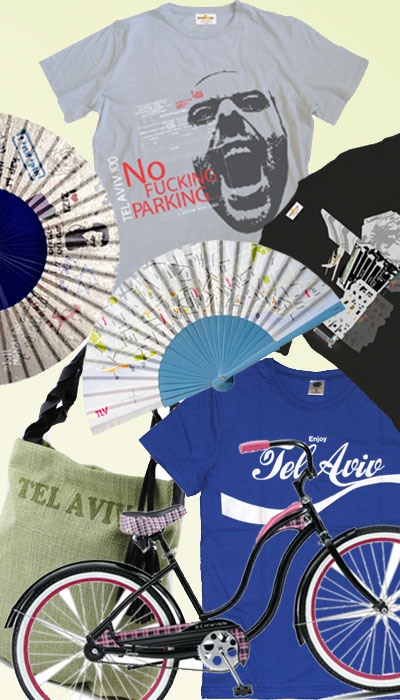 מימין למעלה ובכיוון השעון: חולצת טי (אין חנייה לעזאזל) של רשת TSHOP, חולצה made in tlv, מניפה באיור מפת העיר תל אביב של המותג fancy (בלעלא הצרכניה לעיצוב ישראלי), חולצה כחולה made in tlv, אופני קרוזר של שווי, תיק של תיק התיקים ומניפה מאוירת עם סמלי העיר והמדינה (להשיג בקפה ביזאר)