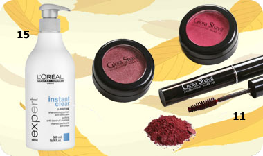 (11) עונת הבציר. המאפר גיורא שביט מציע איפור בגוון היין על טהרת גווני בורדו חזקים למראה קלאסי ורענן: צללית אבן ב-5 גוונים שונים ומסקרה חדשה בגוון יין המעגלת ומעבה ריסים.