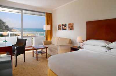 חדר במלון שרתון תל אביב. הכי רומנטי להתבונן יחד בשקיעה בלי לצאת מהמיטה