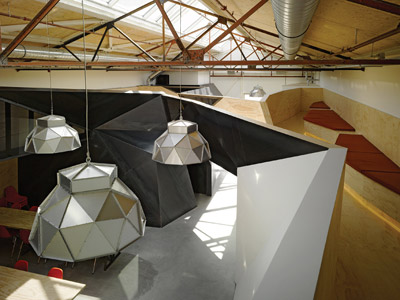 לדברי האדריכלים, המעברים החדים והפשוטים לכאורה בין שחור ללבן, בין פרטי לציבורי ובין משחק לעבודה הם חלק מרכזי בעיצוב. המבנה המצולע של הקירות והמבנים בחלל נועד להזכיר צוקי הרים ומשטחי החלקה – אתרים הקורצים לחובבי הספורט האתגרי. הרושם הראשוני שמתקבל הוא של חלל דינמי ולא צפוי שמזמין לגלות מה נמצא בתוכו. הקירות היוצרים את חדר הישיבות למשל מצולעים ובעלי מראה קמור, והחדר מואר מבפנים באמצעות פס של תאורת לד בצבעים משתנים של אדום, כחול וירוק.