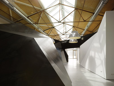 במרכז החלל ניצב מבנה זכוכית המוקף במתכת שחורה ומחוררת – זהו אחד מחדרי הישיבות. בשעות הערב, כשהאור המלאכותי בוקע מבעד לזכוכית ולנקבים שבמתכת, נוצר רושם דרמטי במיוחד, והמבנה מזכיר מטאור נופל. לא רק הקירות משווים למבנה מראה ייחודי, אלא גם התקרה ה"עוקבת" בשיפועיה אחר תקרת המקום, באופן שיוצר הקבלה צורנית מעניינת והרמונית.