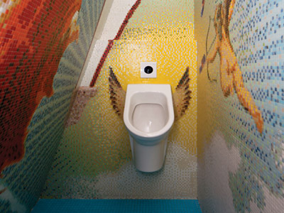 אחד האלמנטים המרשימים במקום הוא קירות הפסיפס בחדרי השירותים. קירות אלה מציגים עבודות פסיפס מרהיבות המחקות את ציורי הפרסקו הרנסנסיים. המתכננים החליטו לקרוא לחדרי השירותים Holly Shit שכן על קירותיהם מתנוססות דמויות של מלאכים ונזירות, המגשימים חלומות "מטורפים" מתחום המוזיקה והספורט האתגרי כמו תקלוט ותעופה. ההחלטה הייתה לקחת אלמנטים הקשורים לדת הנוצרית ולעשות בהם שימוש שהוא מצד אחד נועז ומצד אחר לא מקומם (ישו או סמל הצלב אינם מופיעים שם) אלא בגבולות הטעם הטוב.