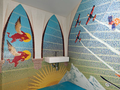 קירות הפסיפס בחדרי השירותים במשרדי רד בול