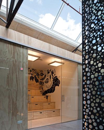 שמות החללים במבנה שייכים לעולם התעופה והצלילה או שאולים מתרבות הרחוב: The Landing הוא שמה של עמדת הקבלה, The Dive הוא חדר האוכל והמטבח, ה-Crash Room הוא אחד משני טרקליני הסבה המרוהט בספות נוחות למנוחה, וה-Sound Clash הוא חדר ישיבות ועמדת די-ג'יי. על מרחב דינמי ורב שימושי זה אפשר להשקיף מגשר מעוקל המהווה קומת ביניים. בגשר מוצבות ספות נמוכות לישיבה ומגיעים אליו דרך מדרגות המשמשות גם כחללי אחסון.