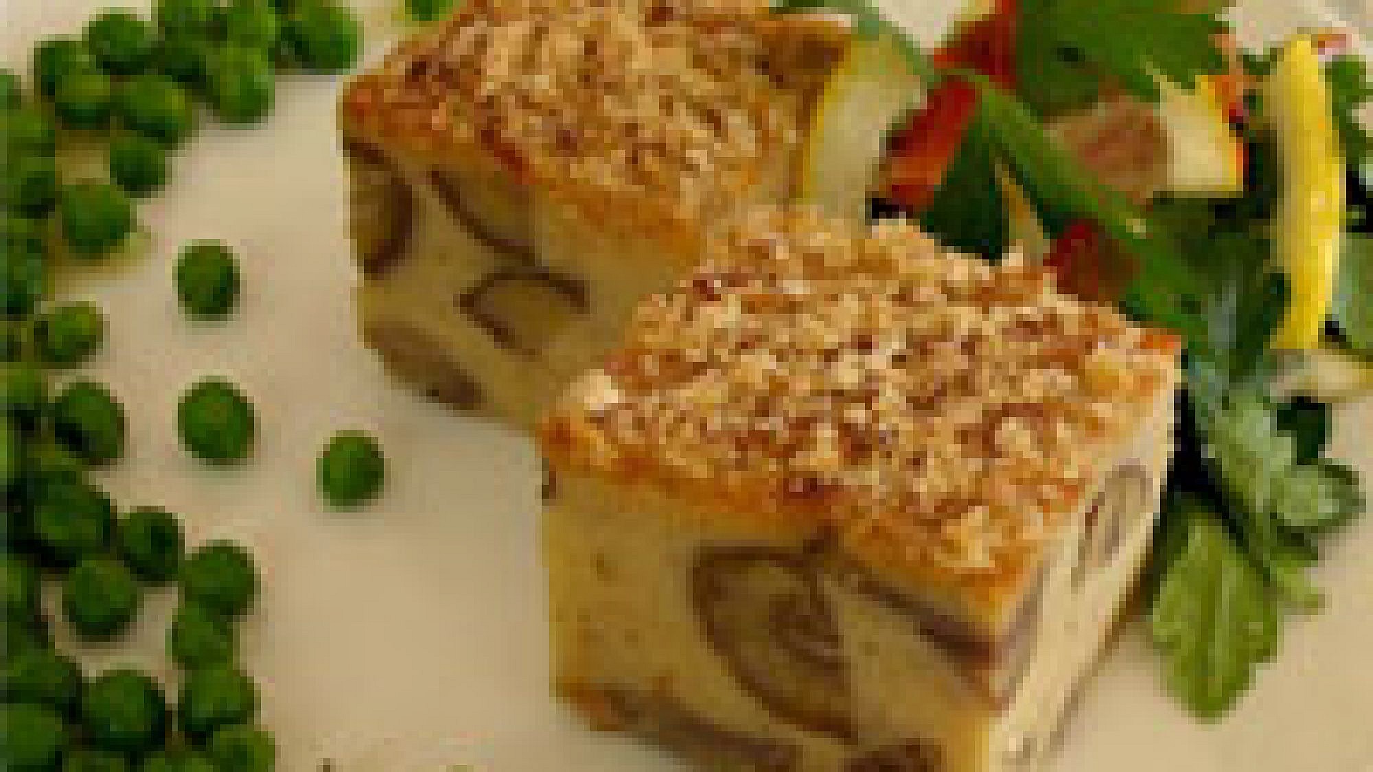 - משטחים את התערובת בתבנית משומנת ובעזרת מזלג יוצרים דוגמת גלים. מזלפים 3 כפות שמן זית, מפזרים פירורי לחם (או קמח מצה) ומזלפים את שמן הזית הנותר. אופים כ-35 דקות עד שפני המאפה מזהיבים.