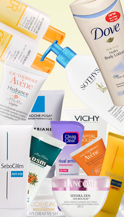 מימין למעלה ובכיוון השעון: קרם גוף דאב, תחליב גוף סוטיס, קרם הגנה סבוקלם, קרם הגנה אוון, קרם הגנה וישי, קרם לחות C&C, ג'ל לה רוש פוזה, קרם לחות לנקום, קרם לחות לוריאל פריז, קרם גוף אובליפיחה DSM, קרם לחות סבוקלם, קרם לחות אוון, קרם הגנה ד"ר OR