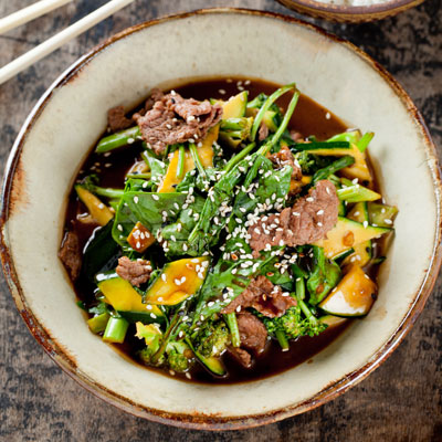1. מחממים ווק על אש גדולה, מוסיפים את שמן הסויה ומטגנים את הבשר במשך דקה. מוסיפים את הירקות ומקפיצים במשך דקה.