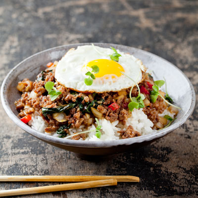 4. מוסיפים את הבזיליקום ומקפיצים עוד כמה שניות. מניחים את התבשיל על האורז ועליו את ביצת העין הרכה. מקשטים בבצל ירוק.