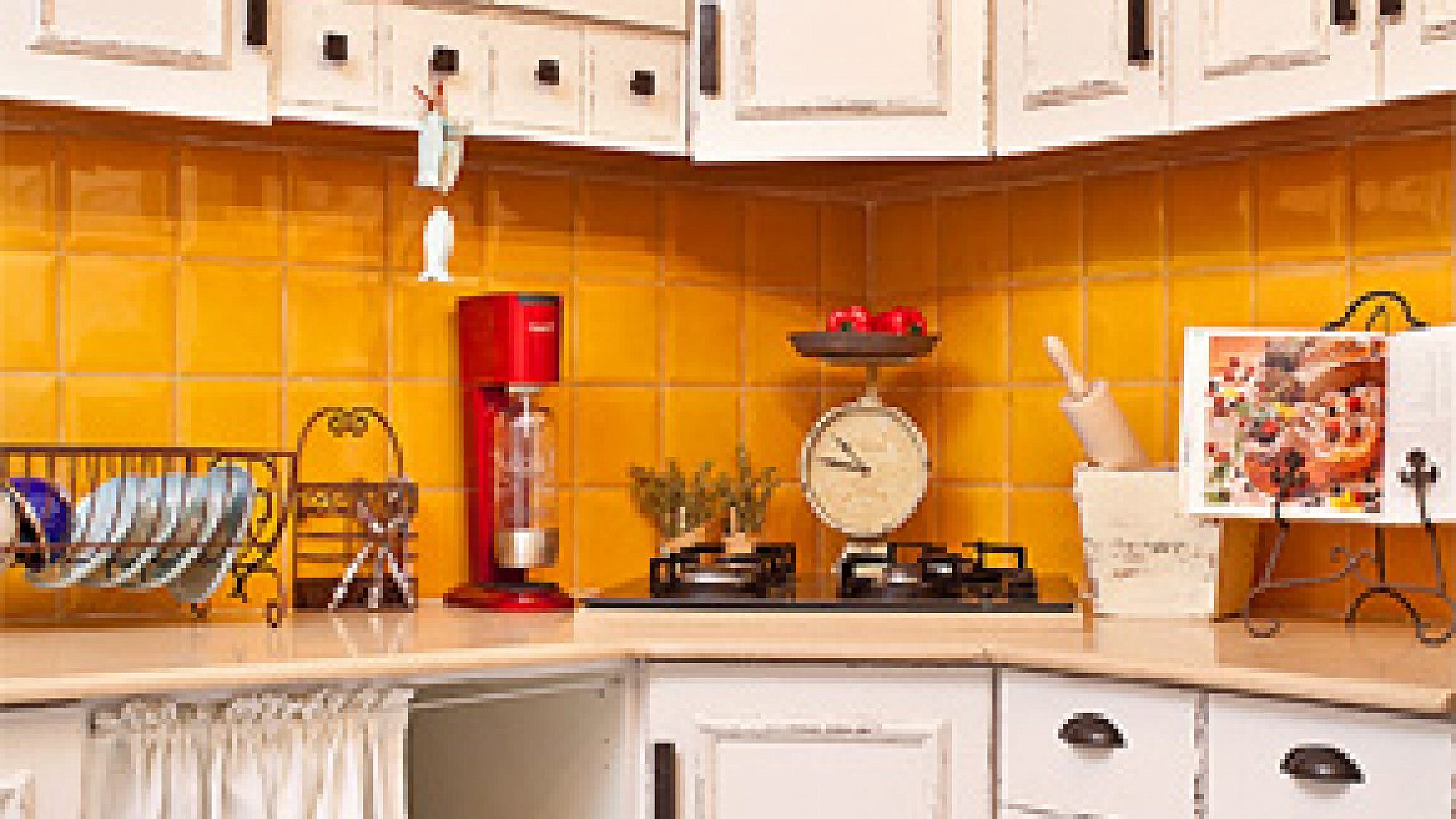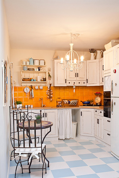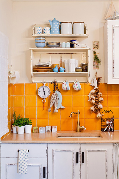 בשלב השני טופלו חיפויי הקיר שמעל השיש והרצפה. הקיר חופה באריחים בגודל 18X18 סנטימטרים בצבע חרדל מבריק ללא פוגות כניגוד לארונות הבהירים, והרצפה חופתה באריחים בצבעי תכלת ולבן בגודל 30X30 סנטימטרים בדוגמת לוח דמקה. שילוב הצבעים שבחרה בלבול אינו טריוויאלי: חרדל זועק על הקיר מול רצפה משובצת בצבעים בהירים. התעוזה השתלמה והמראה שהתקבל מושך את העין מיד ויחד עם זאת נעים והרמוני מאוד. קירות המטבח נצבעו בצבע שמנת ניטרלי אבל חם ומלטף. כל תוספת צבע בשלב הזה הייתה גורעת ולא מוסיפה.