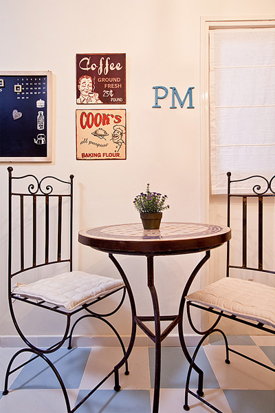 למטבח נוספו גם שולחן בית קפה רומנטי ושני כיסאות למפגש אינטימי בחלל המעוצב.