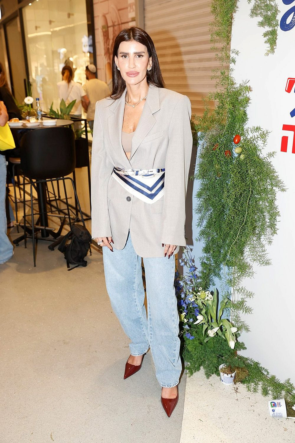אחרי שראינו את אנה ארונוב וקורין גדעון הולכות על גרסה קלילה וקייצית של הטרנד, עינב בובליל נכנסת לתמונה – באירוע של של רשת הקפה גרג ותנובה שהשיקו תפריט חדש על טהרת הקוטג' – ומכניסה לו סטייל טיפה שונה: סתווי, מדויק ובוגר. היא מציגה לוק שמשלב בלייזר מחויט בגוון ניוד-אפרפר של אדיקט עם חזיית טופ תואמת שמבצבצת מבעדו, ג'ינס בגזרה ישרה מטרמינל איקס, מטפחת עם הדפס גיאומטרי (שנרכשה, אגב, משיין, למי שתהתה) ונעלי עקב חומות ומעודכנות, וגורמת לטרנד להיראות פתאום יותר אורבני ואלגנטי, כזה שמתאים גם לבוקר קליל וגם לדייט או לאירוע ערב. מהלך הסטיילינג הזה מציב את המטפחת לא רק כאקססורי שובב, אלא ככלי ליצירת שכבות, עומק, משחקים גיאומטריים ונגיעה של שיק צרפתי בלי להתאמץ.