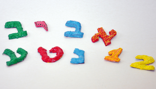 4. צובעים את האותיות בצבעי גואש. מניחים לייבוש, ומדביקים חתיכת מגנט קטנה מאחור.