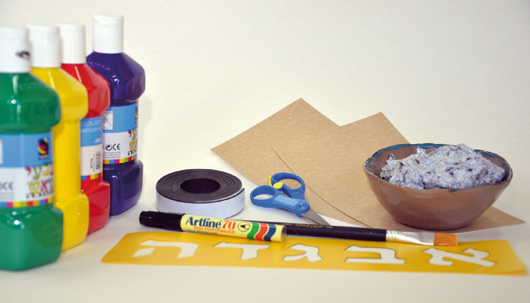 חומרים: עיסת נייר מוכנה, חתיכות קרטון, מספריים, שבלונות אותיות, צבעי גואש, סרט מגנט נדבק.
