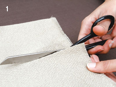 1. מדדו וסמנו את מידות הפלייסמט הרצויות (34X44 סנטימטרים) על גבי הבד החלק וגזרו לפי הסימון. חזרו על פעולה כמספר הפלייסמטים הרצויים.