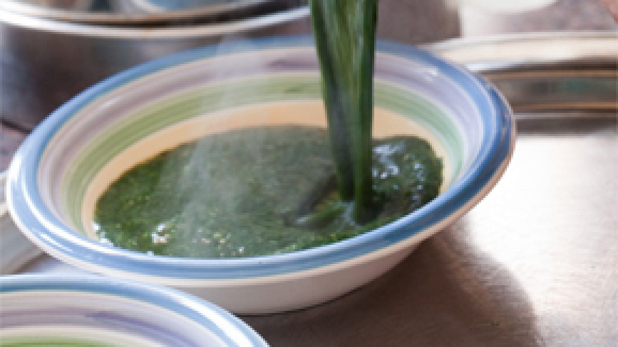 3. טוחנים את עלי המלוחיה במעבד מזון (שומרים בצד מעט עלים טריים לקישוט) ומוסיפים את העלים הטחונים למרק המסונן. מגישים חם ומקשטים בעלים טריים.