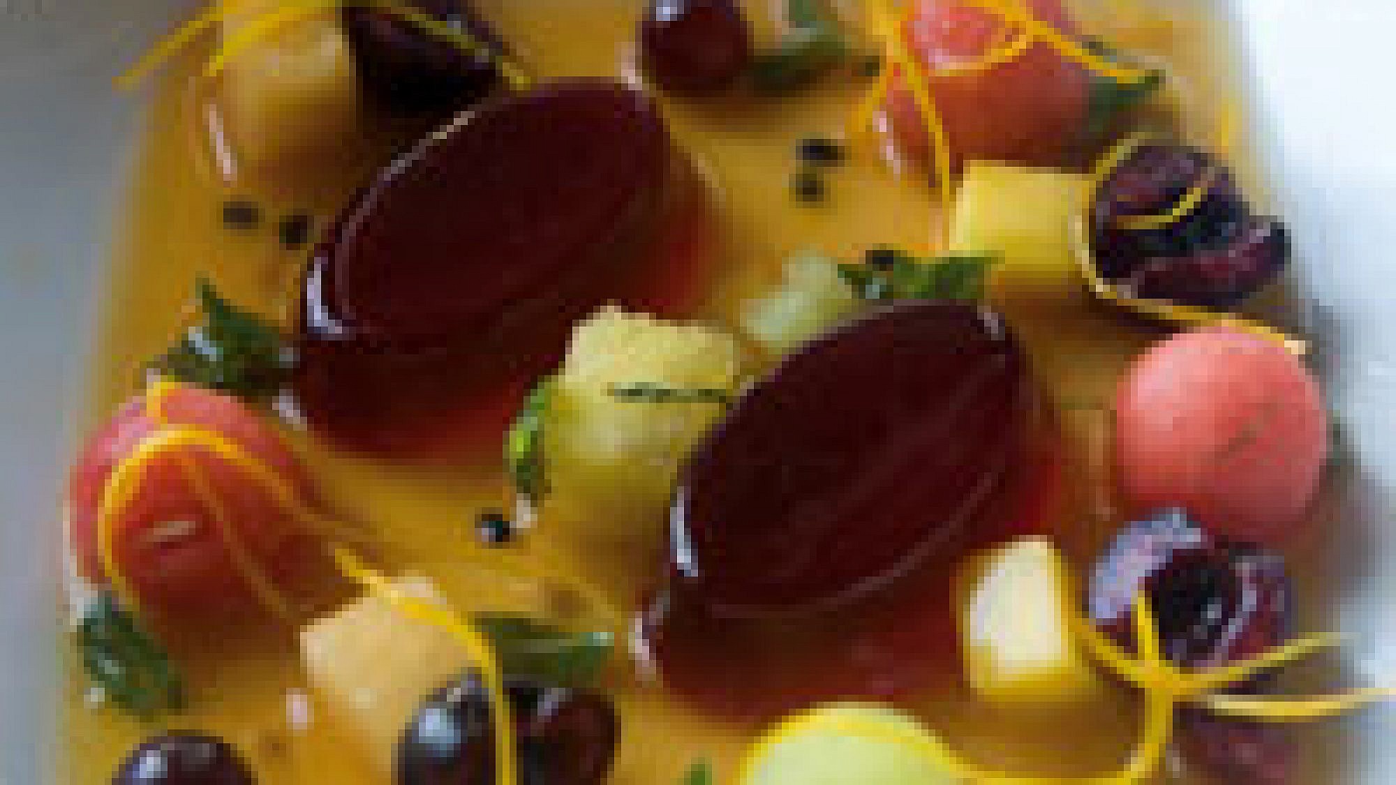 מוציאים את ג'לי הפירות מהכלים ומניחים במרכז צלחת עמוקה. יוצקים את המרק סביב הג'לי,