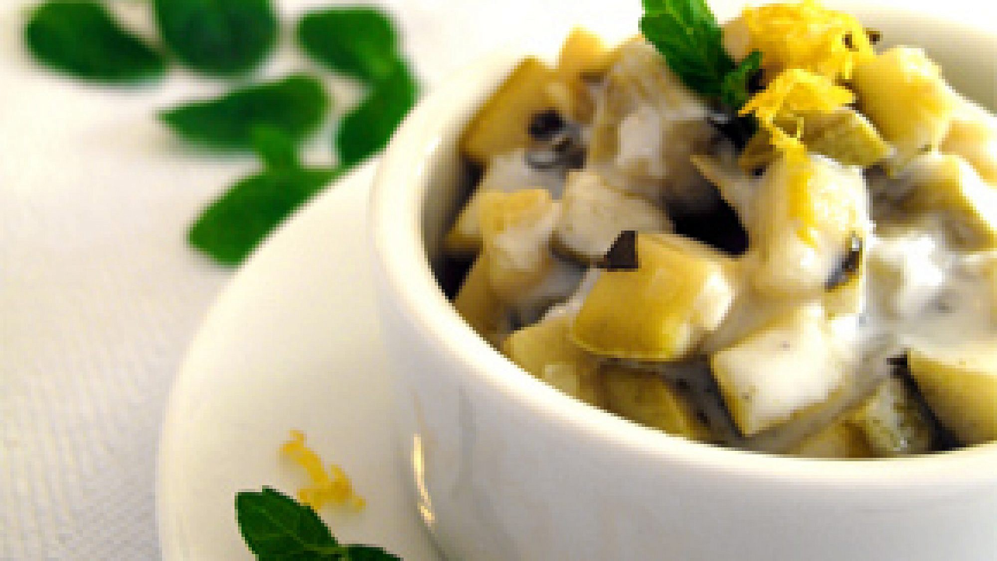 1. מערבבים בקערה את קוביות הקישואים, שיני השום, שמן הזית, 1/4 מכוס מיץ הלימון ו-2 כפות מעלי הנענע.